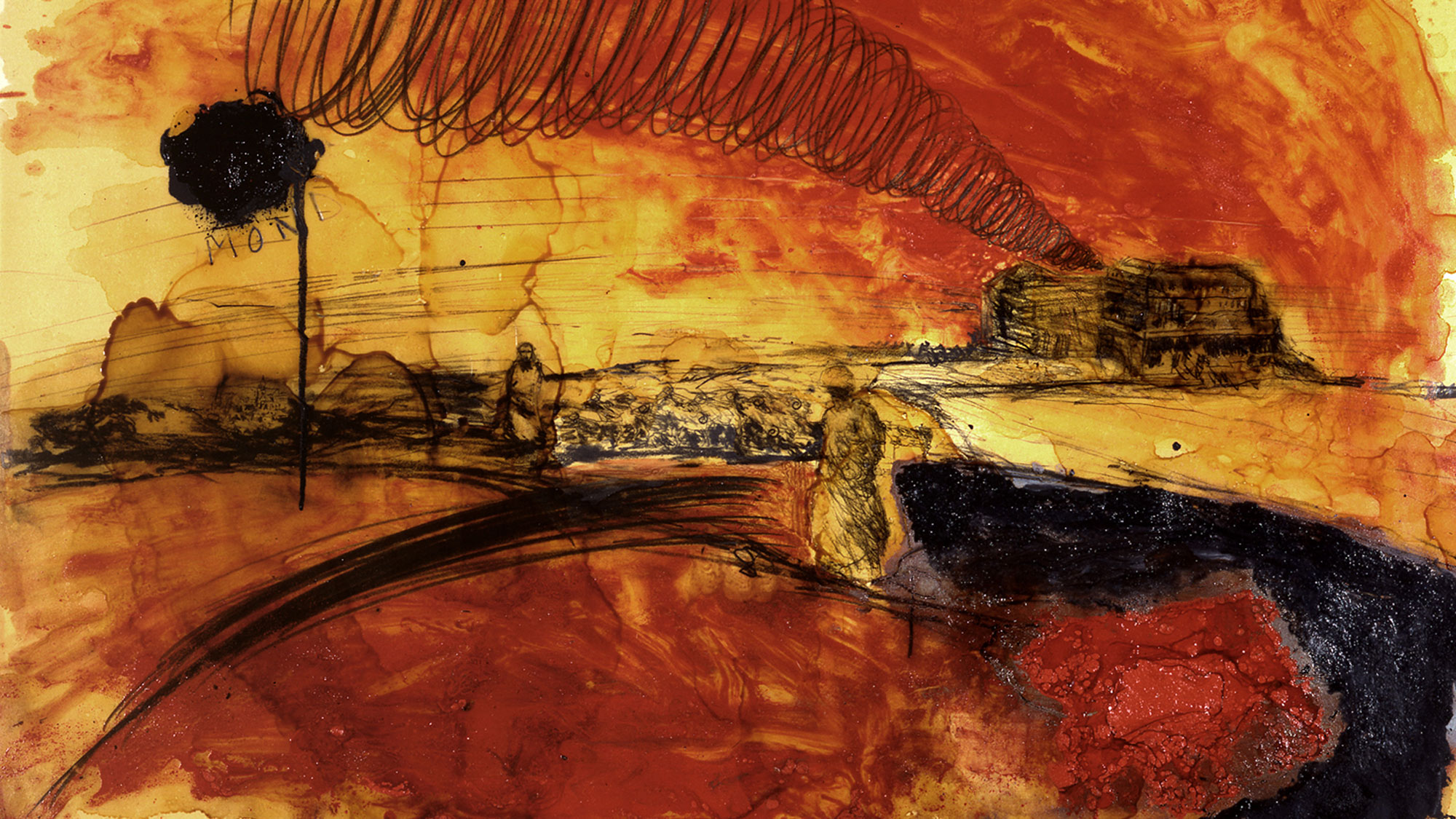 Weitere Videoszenen geben Einblick in die Arbeitsweise von Rainer Lind. Breiige Materien aus honiggelben Leinölspuren, Schellackbraun und Eisenoxyd; rußschwarze, fließende Farbigkeit stehen in Spannung zu trennscharfen Linien und komplexen Liniengeflechten.