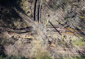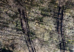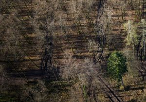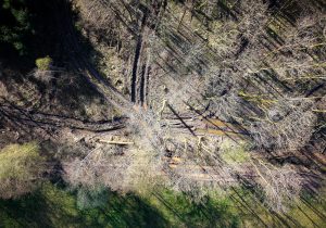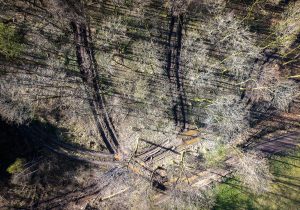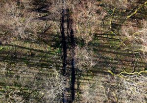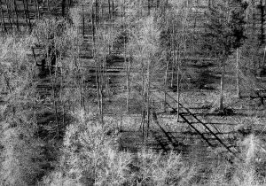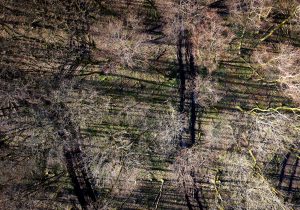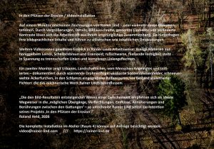 Ein weiterer Monitor zeigt Urbanes, Landschaftliches, auch vom Menschen Angelegtes, Gedemütigtes, erfasst mit streifenden Drohnenflügen oder im von oben ansetzenden Zoom. Verdorrte Sonnenblumenfelder, schneeverwehte Ackerfurchen, in den Schlamm eingegrabene Reifenspuren, ein Bestand skelettierter Fichten. Weitere Videoskizzen sind Alltagsszenen, Gesprächsfetzen, Filmausschnitte. Tagebuchähnliche Fragmente, die das zeichnerische Werk von Rainer Lind beeinflussen.